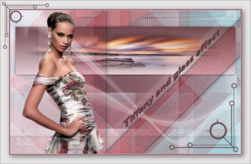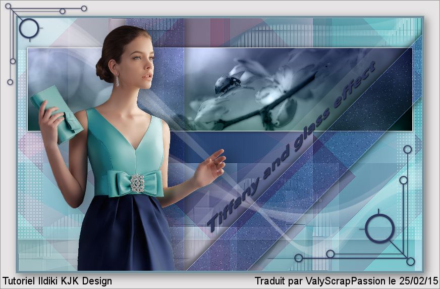 9 Sélections, charger/enregistrer une sélection, charger la sélection à partir du disque, sélection Tiffany selections 6 Remplir de la couleur 8 Sélections, ne rien sélectionner Effets, effets de bords, accentuer Réglage, ajouter/supprimer du bruit, ajouter du bruit comme précédemment Effets, effets 3D, ombre portée 0/0/100/30 noir Calques, propriétés, lumière dure, opacité 65 Effets, effets géométriques, inclinaison comme précédemment Calques, nouveau calque raster