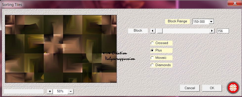 8 Activer le calque du bas Sélections, charger/enregistrer la sélection, charger la sélection à partir du disque, sélection Myka-3 Sélections, transformer la sélection en calque Sélections, ne rien sélectionner Calques, réorganiser, placer en haut de la pile Effets, modules externes, vanderlee, unpluggedX, radial waves